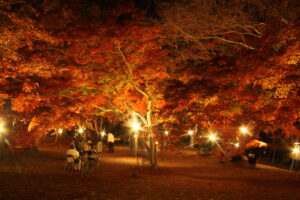 園内には多くのカエデやモミジが植えられ、秋になると一帯が鮮やかな赤や黄色に染まり、まるで絵画のような風景が広がります。