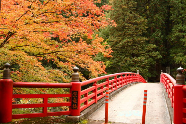 秩父市大滝の三峰山表参道入り口の登竜橋周辺の紅葉です。 橋の下にも降りられる遊歩道がありますので、ぜひ渓谷近くからの眺めもお楽しみください。