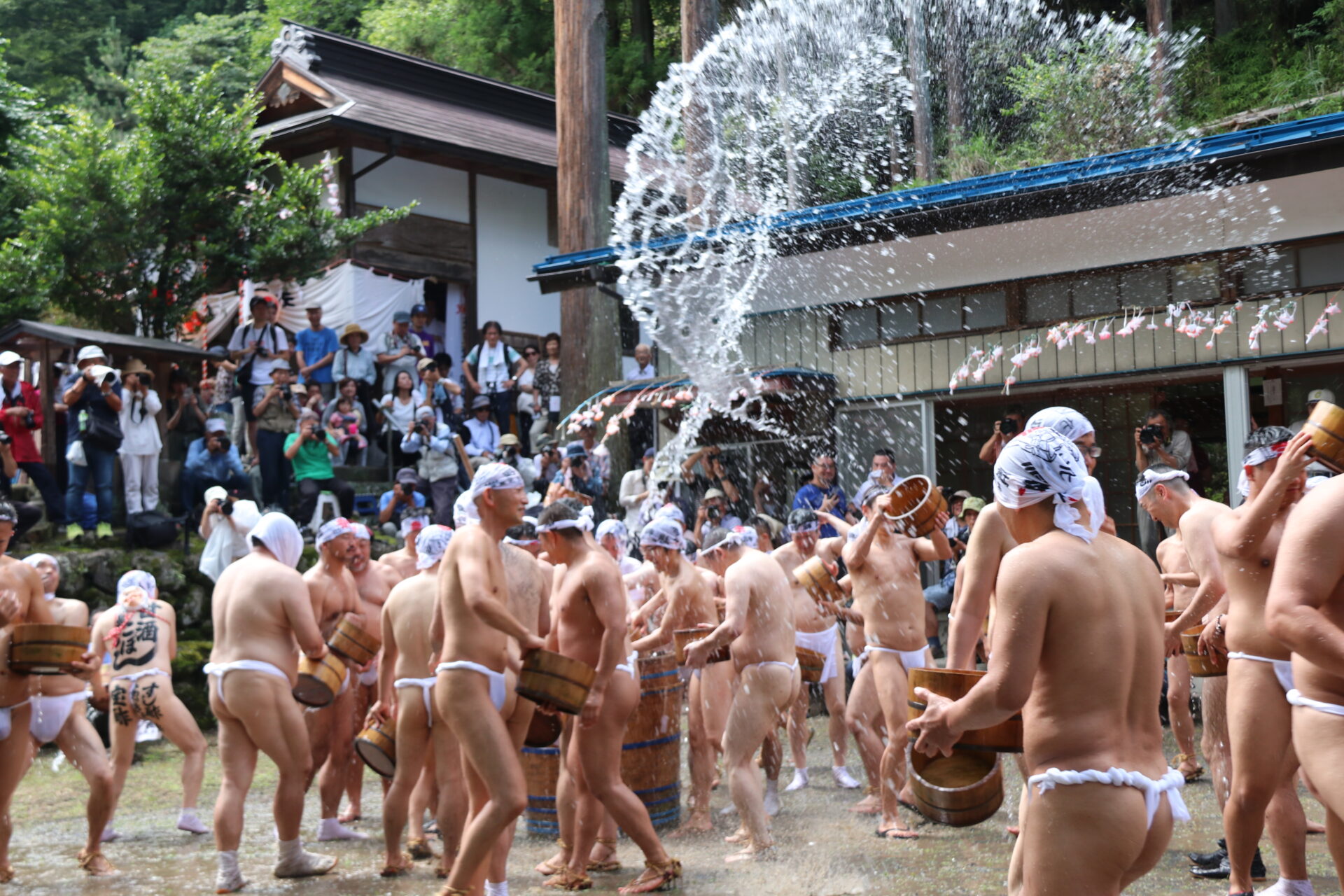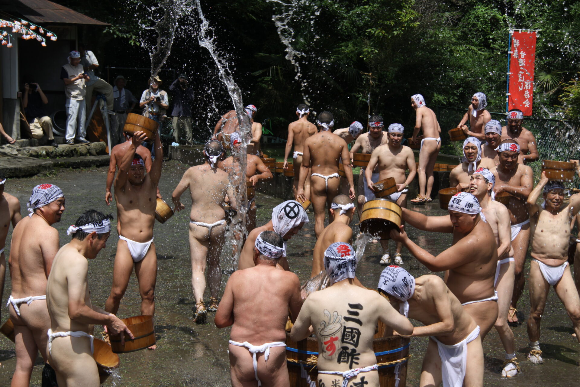 悪疫退散・災厄除けを祈願し、褌姿の男たちが大きな樽に入った甘酒を互いに勢いよく掛け合う勇壮な行事で、古くから地域に伝わる夏の風物詩として親しまれています。