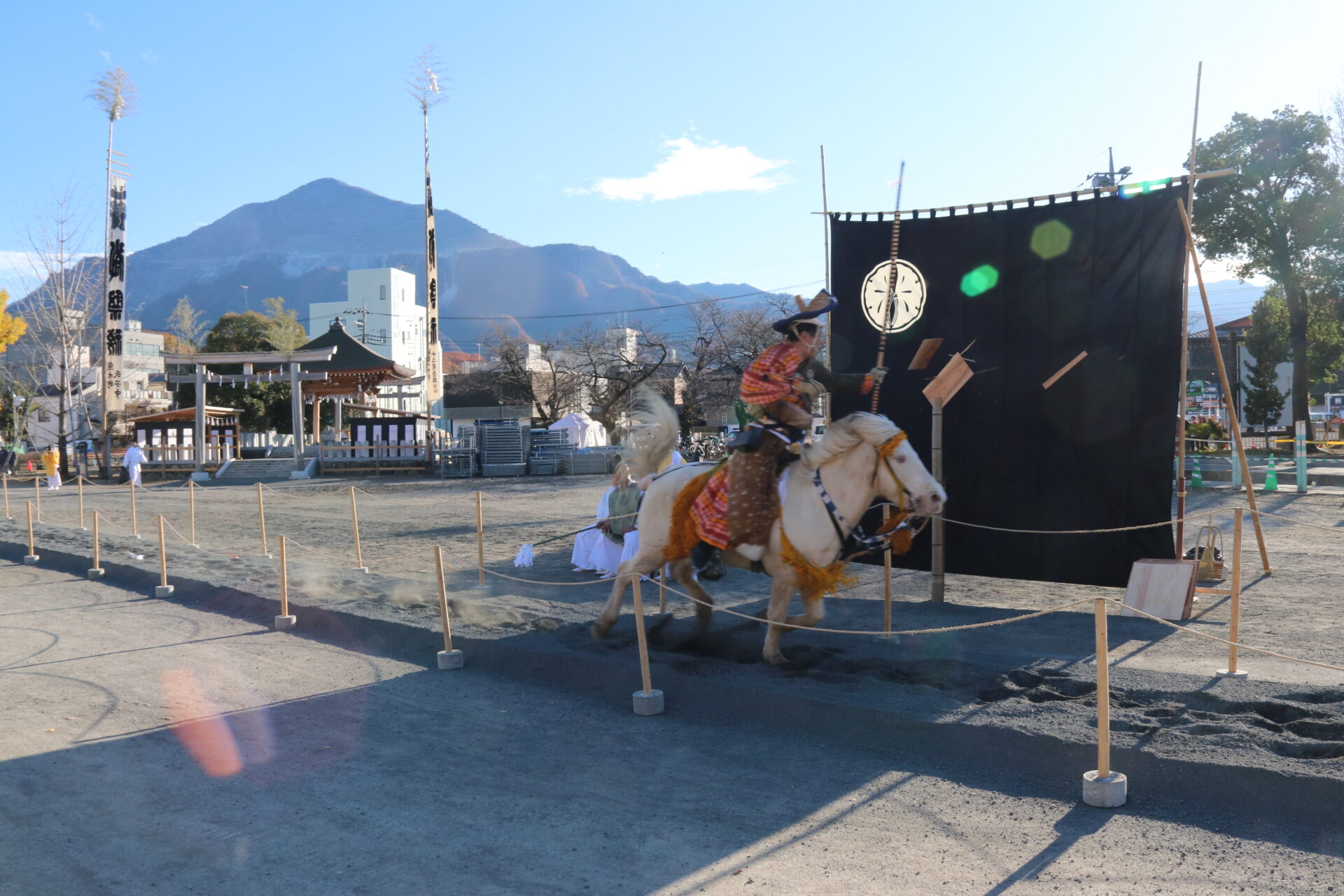 秩父神社の例大祭「秩父夜祭」にあわせて、2014年(平成26年)におよそ780年ぶりに復活した伝統の神事が「流鏑馬(やぶさめ)」です。鎌倉時代から行われていたと伝わるこの神事は、長い年月の間途絶えていましたが、地元有志や関係者の尽力により、荘厳な姿が現代に甦りました。