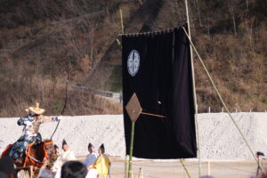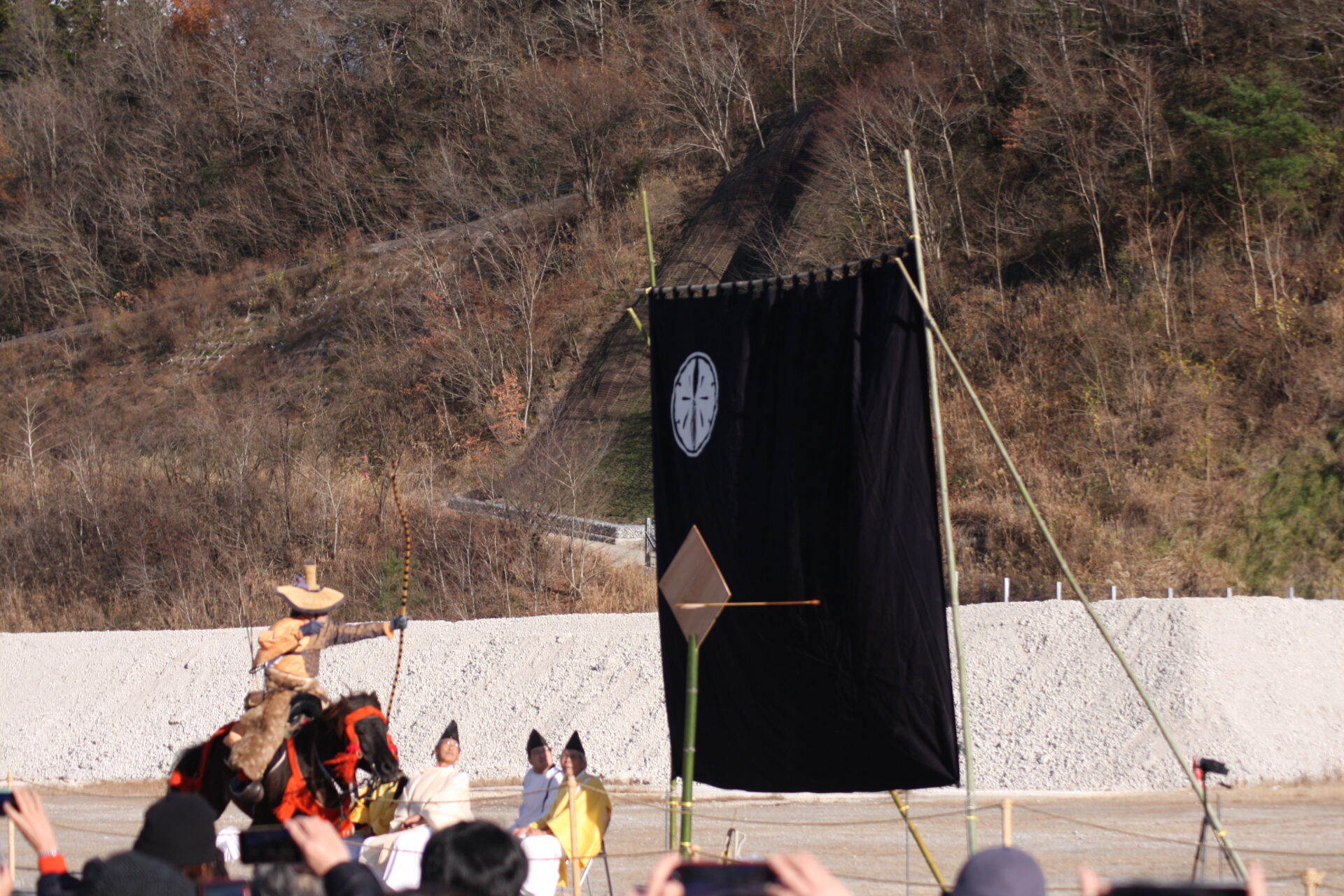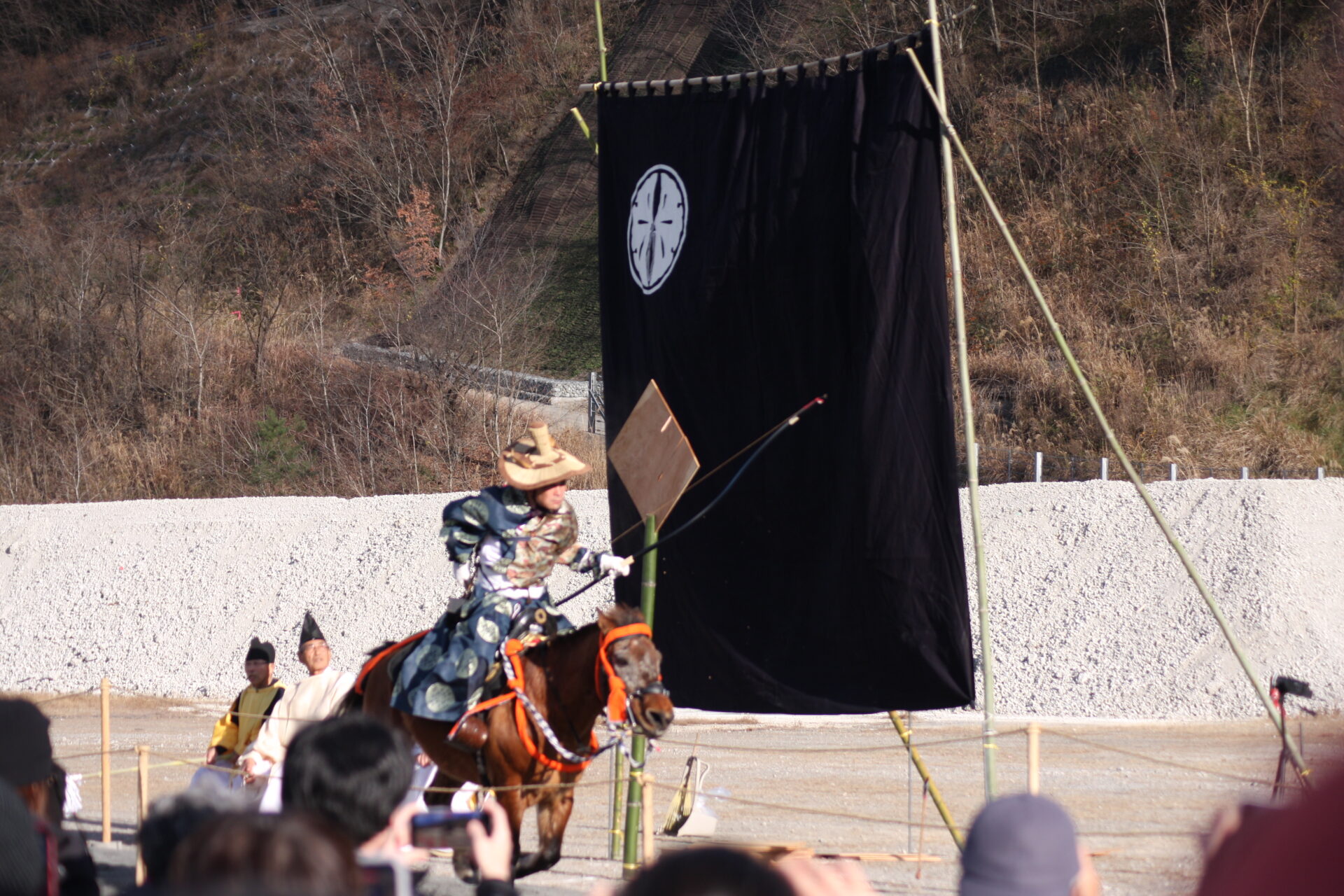 秩父神社の例大祭「秩父夜祭」にあわせて、2014年(平成26年)におよそ780年ぶりに復活した伝統の神事が「流鏑馬(やぶさめ)」です。