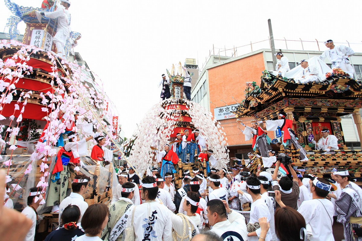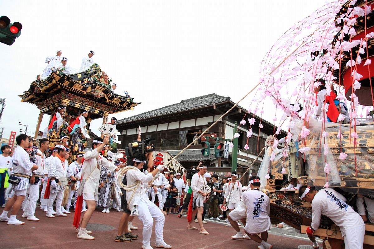 山車同士が向かい合う「すれ違い」や、別れ際に技を競い合う「曳き別れ」など、迫力に満ちた見どころが続きます。