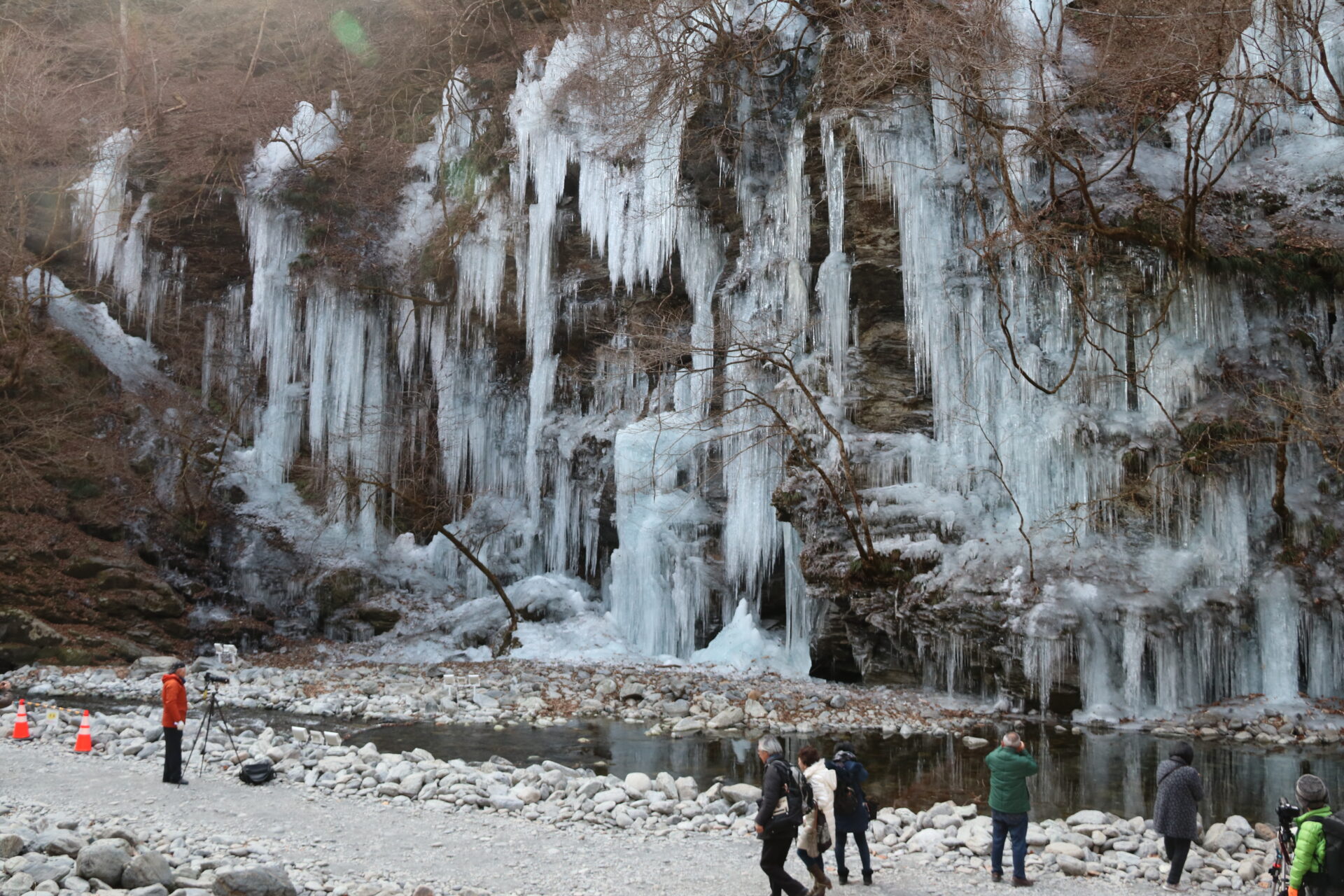 寒さが厳しくなる1月頃に徐々にその姿を現していきます。 荒川右岸にできる氷柱は幅50m、高さ約8m程になります。