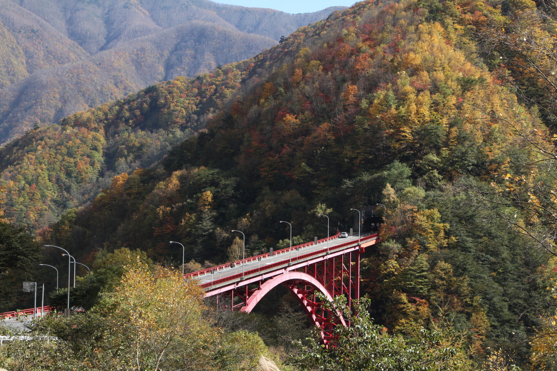 駐車場からは豆焼橋を望むことができ、ぱっと明るい赤が目立つ豆焼橋が紅葉と互いを引き立て合います。